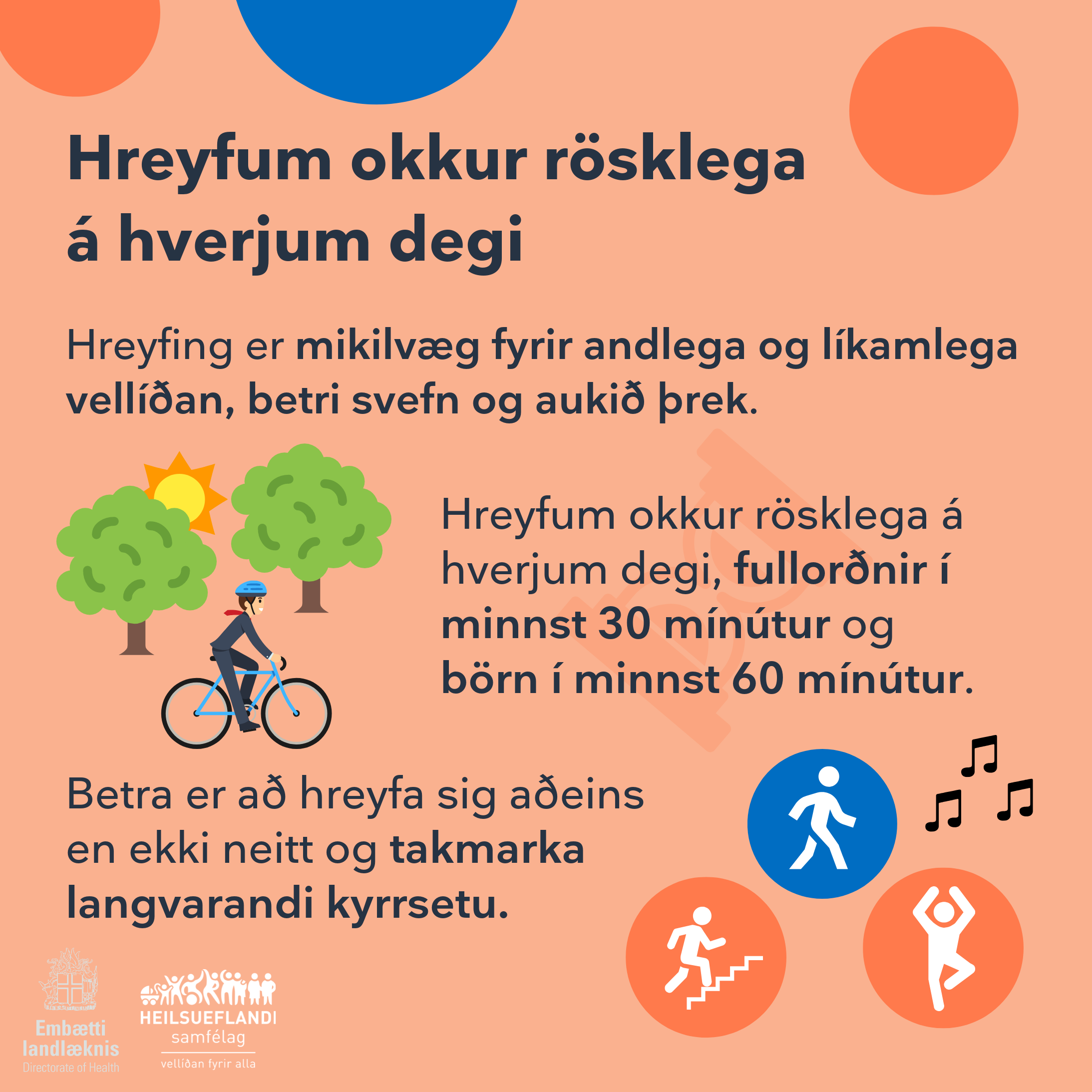 Hreyfing er ein áhrifaríkasta heilsueflandi aðferð sem við höfum. Hún er ekki aðeins mikilvæg fyrir líkamlega getu heldur hefur hún víðtæk áhrif á geðheilbrigði, seiglu og almenn lífsgæði. Alþjóðaheilbrigðismálastofnunin (WHO) mælir með að fullorðnir hreyfi sig að minnsta kosti 150 mínútur á viku við miðlungs ákefð eða 75 mínútur við mikla ákefð – auk styrktaræfinga tvisvar í viku.
