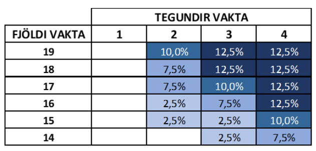 11.1.3.2 - Starfsmann skal ráða á mánaðarlaun/starfshlutfall ef reglubundin vinnuskylda starfsmanns er 20% á mánuði eða meiri. Sé reglubundin vinnuskylda minni og þegar um er að ræða óregluleg vinnuskil er heimilt að ráð hann í tímavinnu. Jafnframt er heimilt að ráða í tímavinnu, óháð vinnuskyldu, skv. grein 1.4.2.