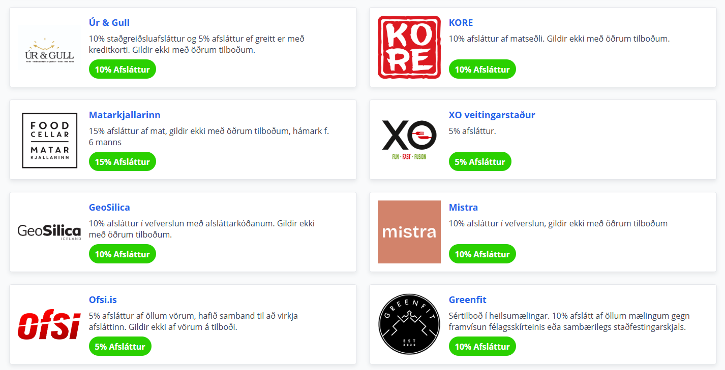 Félagsskírteinið má finna á inni á Mínum síðum ásamt lista yfir þá afslætti sem eru í boði fyrir félagsfólk hverju sinni.