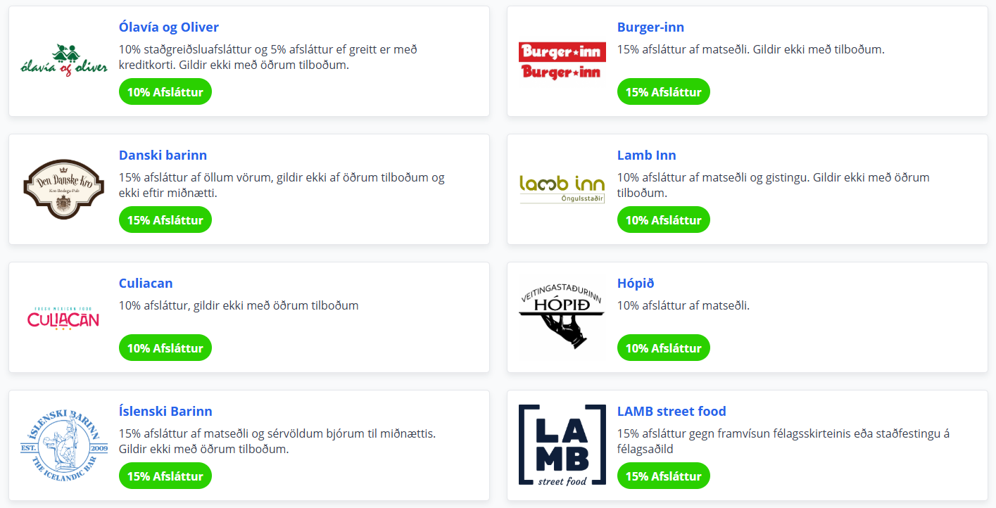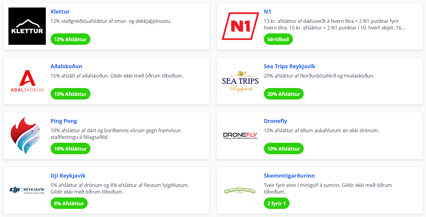 Félagsmenn njóta veglegra tilboða og sérkjara hjá fyrirtækjum og samstarfsaðilum víða um land. Gildir aðeins gegn framvísun félagsskírteinis (Íslandskortsins) eða staðfestingu á félagsaðild.