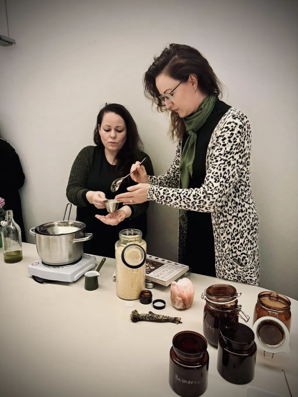 Í gær var haldið námskeið á vegum SfK í gerð lækningasmyrsla. Elsa Ósk Alfreðsdóttir verkefnastjóri SfK hélt námskeiðið en hún er þjóðfræðingur að mennt og hefur meðal annars lagt stund á grasalækningar. Hún stofnaði Venus Heilsu- og jurtasetur og hefur unnið með líkamsmeðferðir, lækningajurtir og stjörnukort.