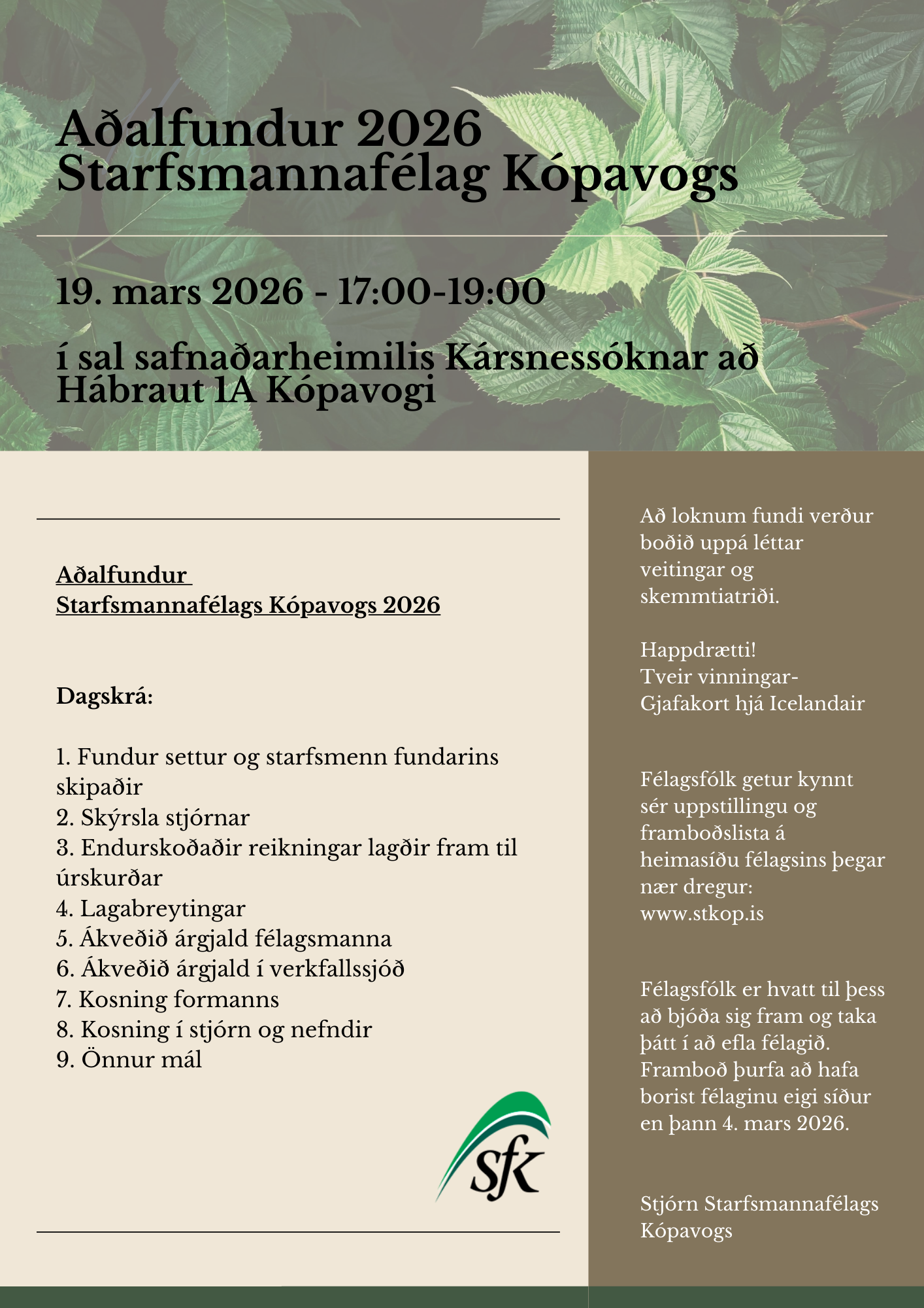 Allar tillögur í stjórnir og nefndir Starfsmannafélags Kópavogs skulu vera skriflegar og berast í tölvupósti til SfK – sfk@stkop.is eigi síðar en 2 vikum fyrir aðalfund, eða til og með 4. mars 2026.