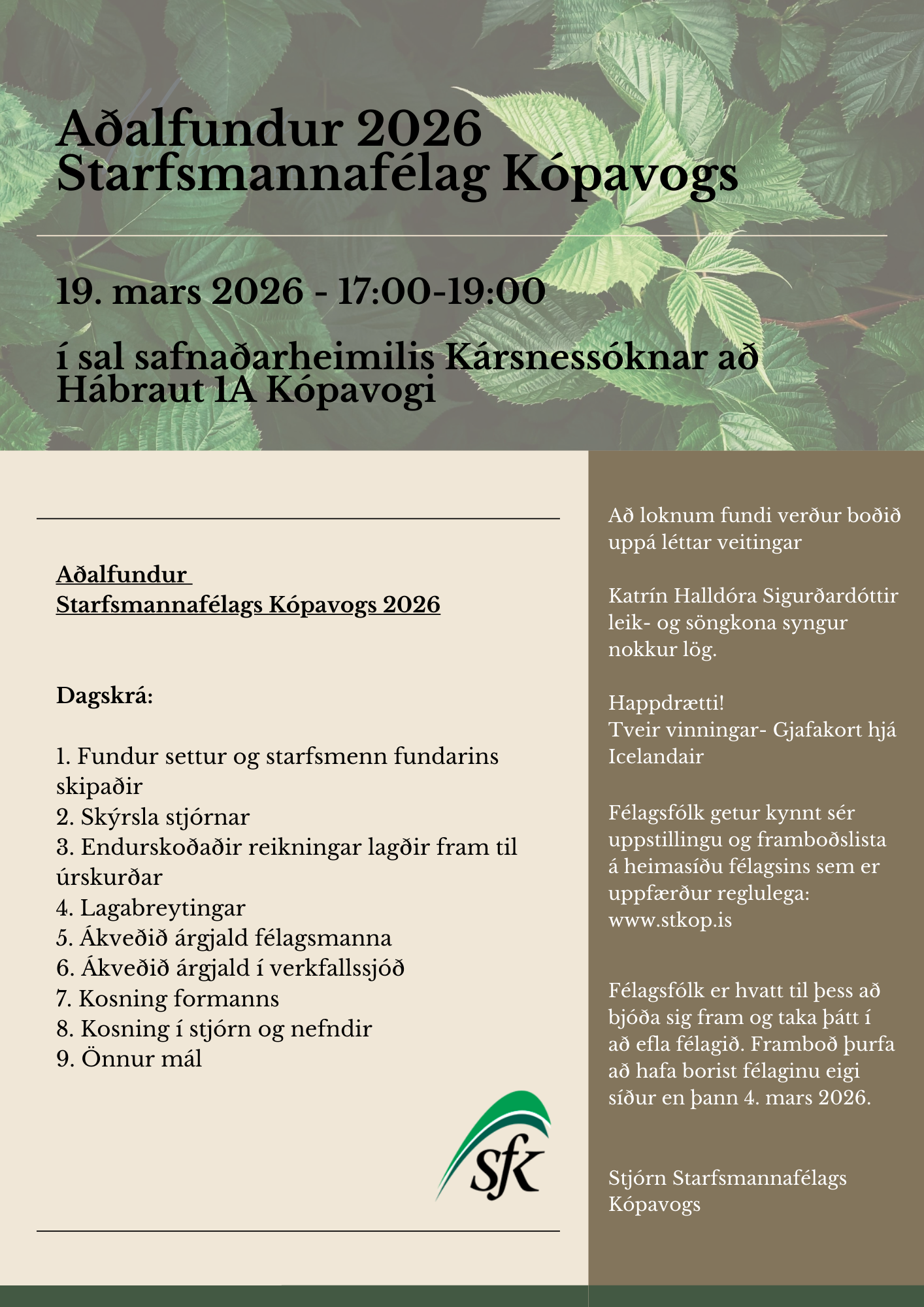 Formaður: Marta Ólöf Jónsdóttir Starfsmannafélag Kópavogs Laus, gefur kost á sér Aðrir í stjórn: Jóhannes Æ. Hilmarsson Húsvörður Stjórnsýslusviði Laus, gefur ekki kost á sér Elísabet Stefánsdóttir Íþróttahús Digranesi Laus, gefur kost á sér Málfríður A. Gunnlaugsdóttir Íþróttahús Digranesi Ekki laus Íris Dögg Sverrisdóttir Bókasafn Kópavogsbæjar Ekki laus