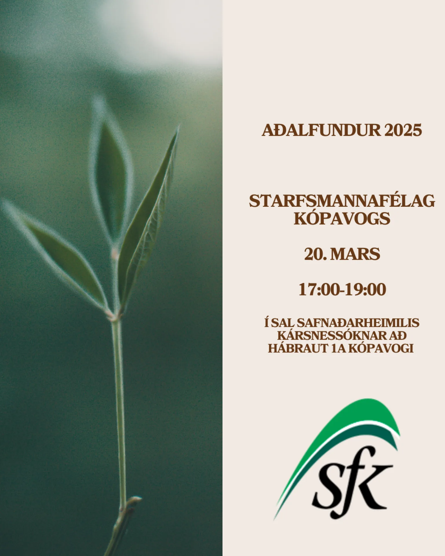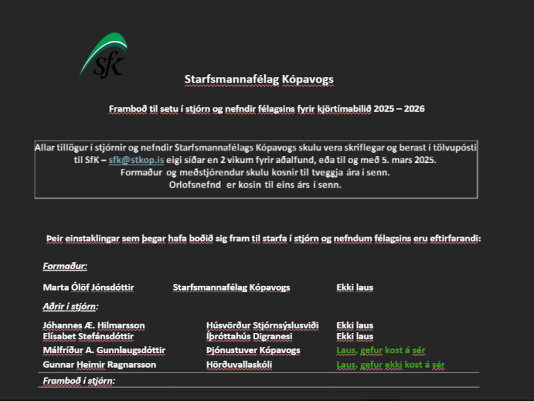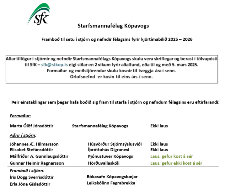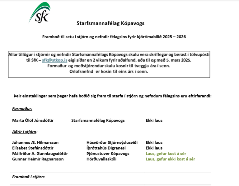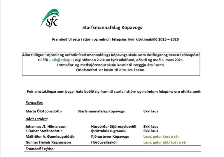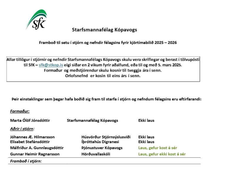 Starfsmannafélag Kópavogs tilkynnir hér með að stjórnarkjör til stjórnar félagsins fer fram á aðalfundi félagsins þann 20. mars 2025.