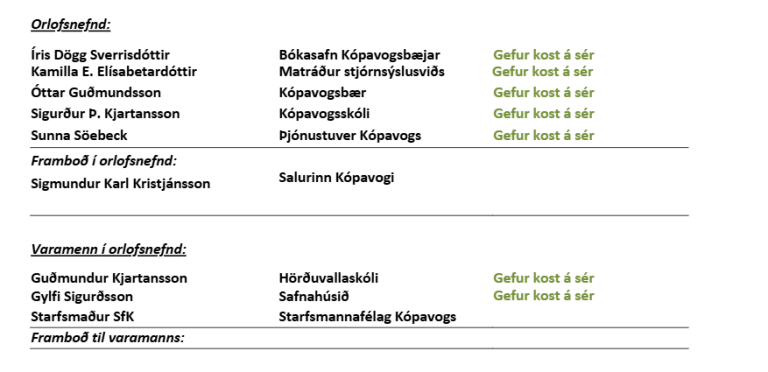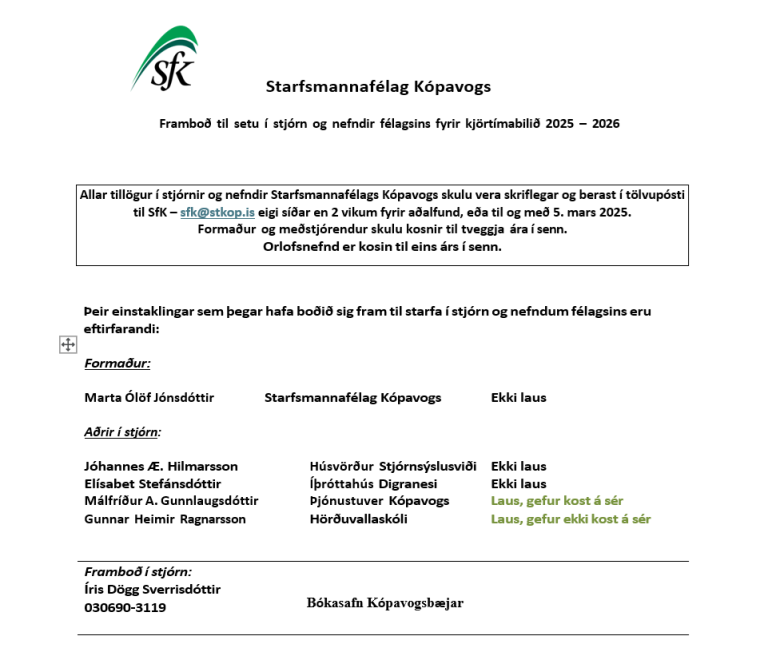 Ég gef kost á mér til áframhaldandi setu í stjórn Starfsmannafélags Kópavogs. Í gengum starf mitt hjá Kópavogsbæ hef ég góða innsýn inn í þau mörgu verkefni sem eru á vegna sveitarfélagsins ásamt því að hafa byggt upp mikla reynslu sem gjaldkeri félagsins, sett mig inn í fræðslumál bæði á vegnum BSRB og Starfsmannafélags Kópavogs. Ég hef látið mig hag félagsfólks SfK á mörgum vettvöngnum varða, eins og í stjórn, ráðum, nefndum, almennri umræðu og annar staðar.
