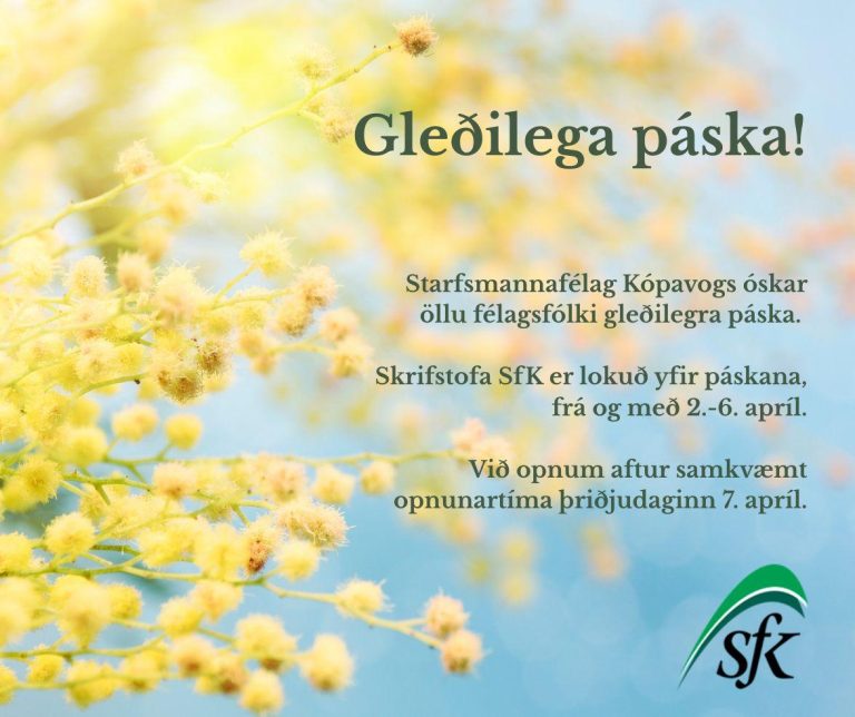 Skrifstofa SfK verður lokuð frá og með 2. apríl til 6. apríl. Við opnum aftur samkvæmt hefðbundnum opnunartíma þriðjudaginn 7. apríl.