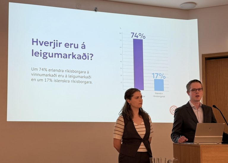 Hagfræðingarnir Róbert Farestveit (ASÍ) og Jana Víglundsdóttir (BSRB) fóru yfir tölfræði markaðarins og þróun leigumarkaðarins síðustu áratugi. Leigumarkaðurinn hefur stækkað verulega frá efnahagshruninu 2008 og í dag búa um 28% landsmanna í leiguhúsnæði, þar af tæpur fjórðungur barna og um þriðjungur einstæðra foreldra.