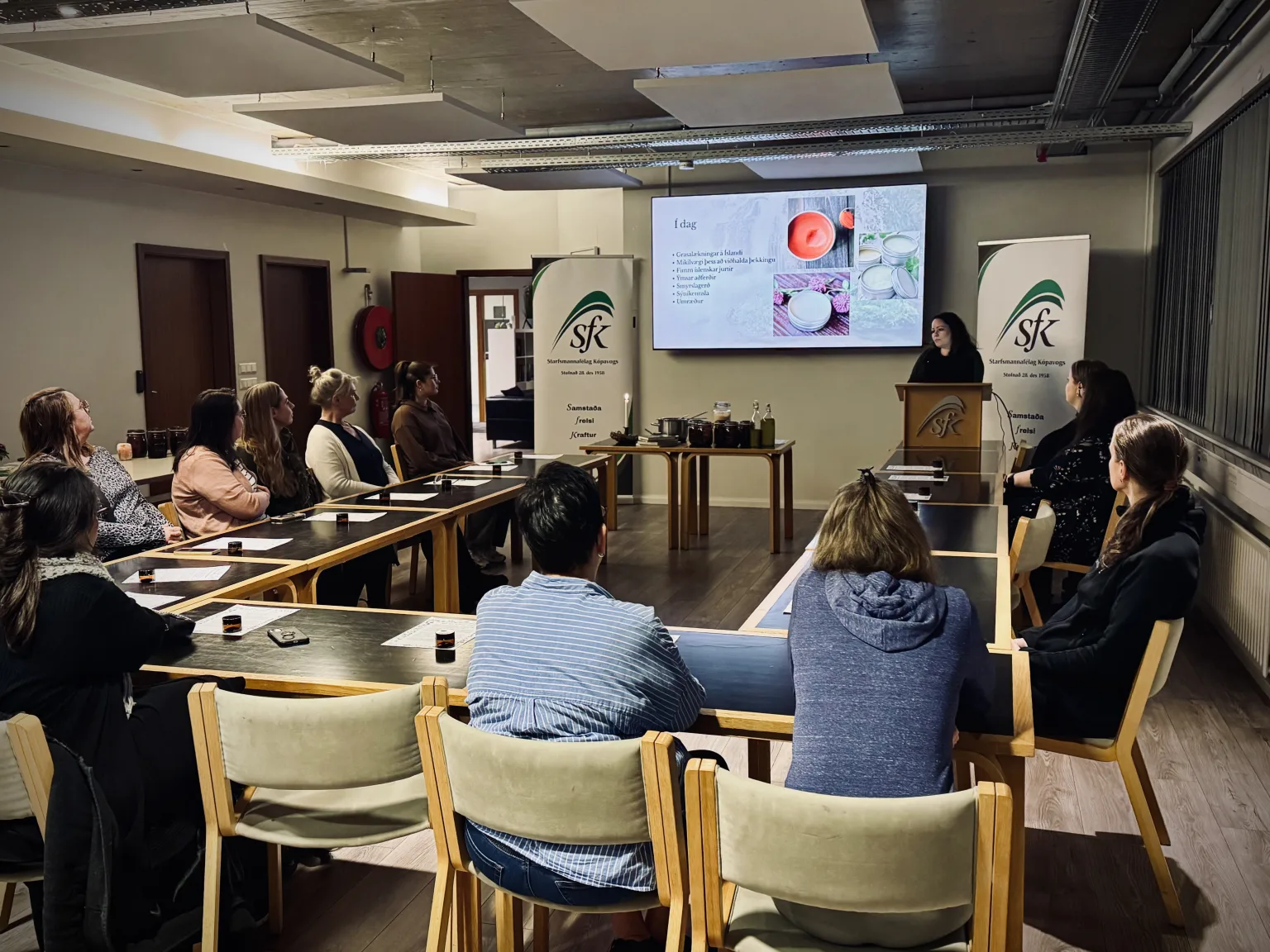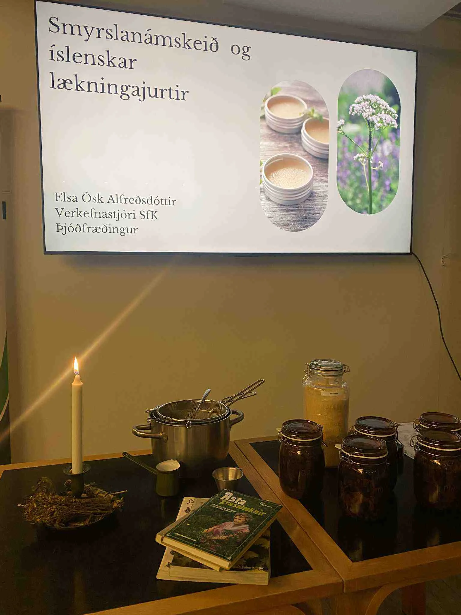 Í gær var haldið námskeið á vegum SfK í gerð lækningasmyrsla. Elsa Ósk Alfreðsdóttir verkefnastjóri SfK hélt námskeiðið en hún er þjóðfræðingur að mennt og hefur meðal annars lagt stund á grasalækningar. Hún stofnaði Venus Heilsu- og jurtasetur og hefur unnið með líkamsmeðferðir, lækningajurtir og stjörnukort.